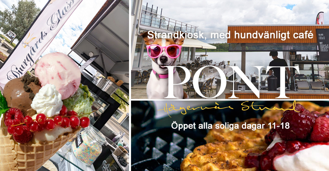 Gäster, 2- och 4-benta! Välkommen till vår strandkiosk/-café i Hägernäs, alla soliga dagar i sommar, 11-18. Vi erbjuder glass, våfflor, fikabröd, mackor, med mera. Kom för en god glass på kajkanten, men klicka här och läs mer för att ta del av hela menyn...