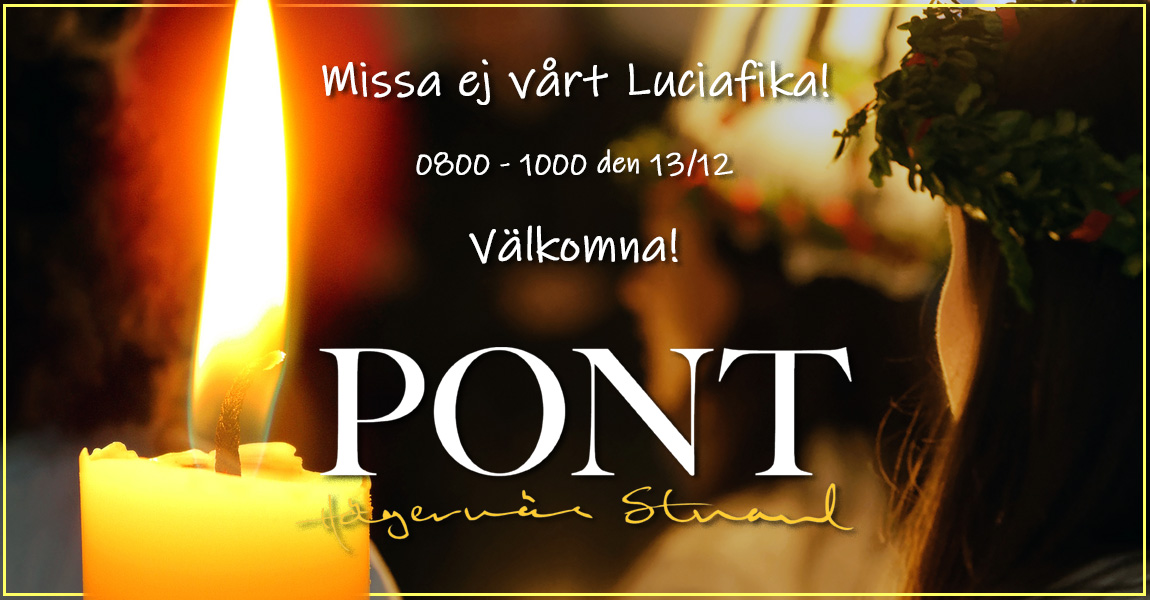 Naturligtvis har vi Luciamorgon här på strandens kant. Den 13 december öppnar vi 0800 och erbjuder er välkomna till ett stämningsfullt och gott Luciafika. Vi dukar upp en buffé med prinskorv, köttbullar, glögg, Janssons och sillar samt lussebullar, pepparkakor kaffe/te á 295kr...